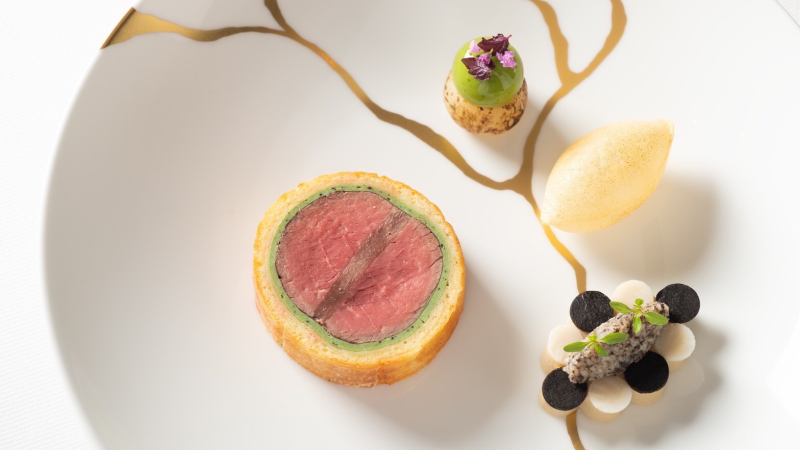 * Marinated sweet shrimp with broad beans and Hyuganatsu citrus * Firefly squid fricassee with bamboo shoots cooked in dashi broth * Pan-seared sea bass with spring vegetables and saffron sauce * Roasted lamb with its jus, white asparagus, and a hint of local mustard * Pre-dessert * Grand dessert * Coffee or tea and petit fours