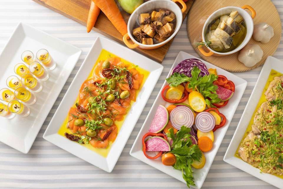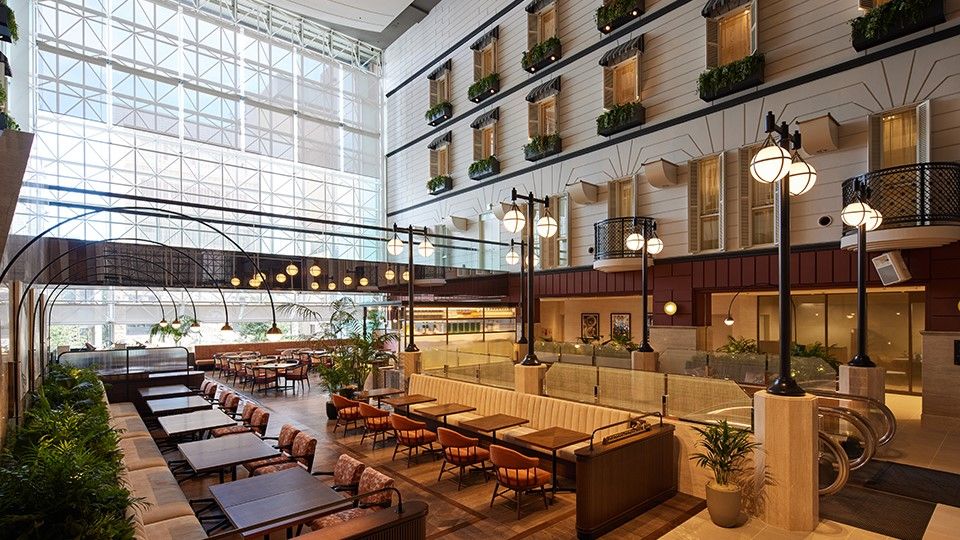 ホテル内にあるレストラン。天井が高い開放的な空間の中で、お食事やスイーツを味わったり、お茶を飲みながらゆったりとおくつろぎいただけます。朝食からディナータイムまで幅広い時間帯でご利用が可能です。ティータイムには、季節のケーキやドリンクがセットになったアフタヌーンティーセットをご用意。夜間はビール、ウイスキー、ワインなどのアルコールや飲み放題もございますので、バー感覚でお立ち寄りいただけます。